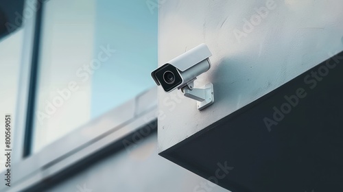 A sleek, white outdoor security camera mounted on a pale wall against a soft-focus glass window reflecting the sky