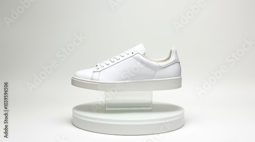 A sleek white sneaker with clean lines and a minimalist design, elegantly placed on a floating circular pedestal.