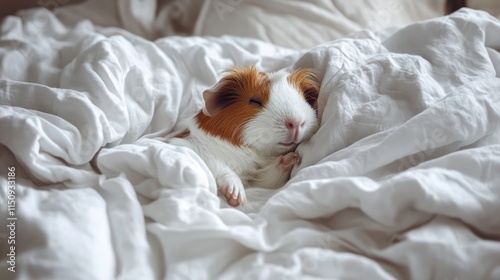 A sleeping guinea pig nestled in soft, white bedding, exuding tranquility and comfort.