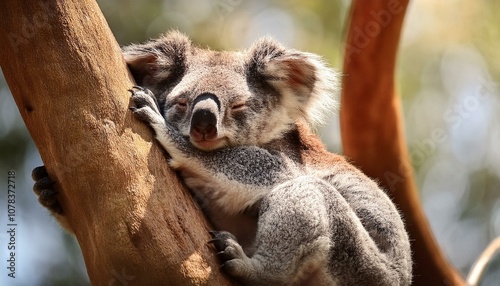 A sleepy koala lounging comfortably in the branches of a eucalyptus tree.