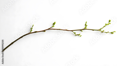 A slender branch with small, vibrant green buds, elegantly arranged against a stark white background. Symbol of spring and new beginnings.