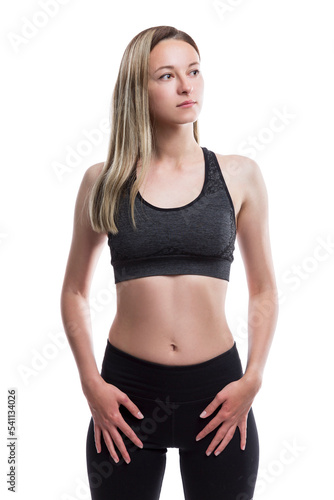 A slender young girl in black tight-fitting sportswear stands and looks away. Activity and energy. Isolated on white background. Vertical.