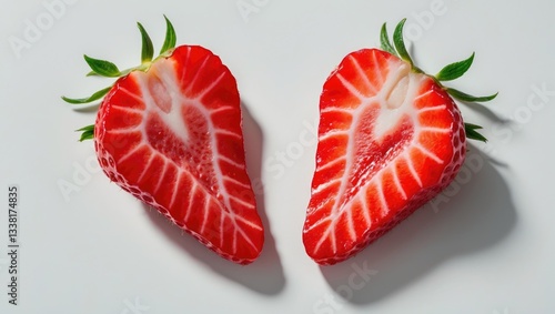 A slice of a red strawberry in the shape of a heart set against a white background.