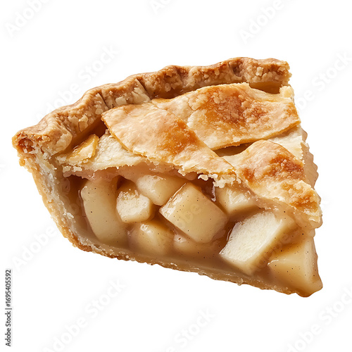A slice of apple pie with a flaky crust and visible chunks of apple filling.