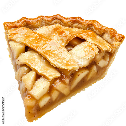 A slice of apple pie with a golden lattice crust and visible apple chunks.