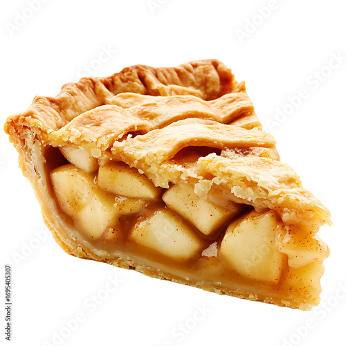 A slice of apple pie with a golden lattice crust, revealing juicy apples inside.