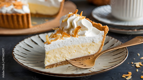 A slice of coconut cream pie with a flaky crust, topped with whipped cream and toasted coconut flakes, presented on a dessert plate.