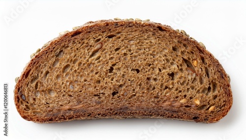A slice of crusty bread with seeds.
