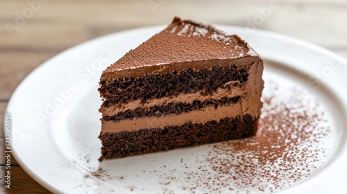 A slice of decadent chocolate cake with layers of rich chocolate ganache and a dusting of cocoa powder, placed on a plain white plate, Slice centered with a slightly angled view