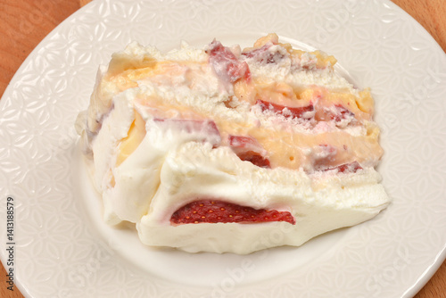 A slice of Frozen wind cake (layered meringue cake with whipped cream and fruit) is presented on a white ornate plate