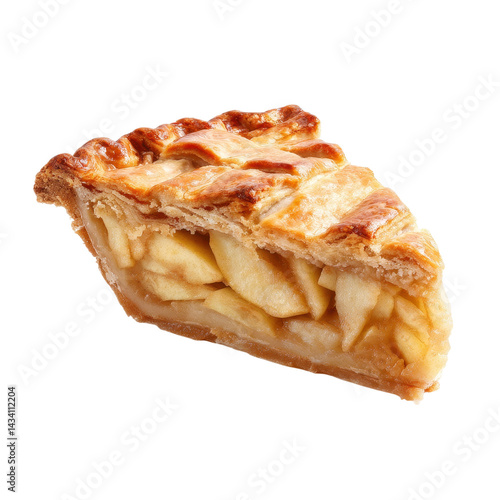 A slice of golden-brown apple pie filled with tender apple slices, showcasing a flaky crust and appealing texture.