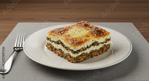 A slice of moussaka on a white plate with a fork on a gray placemat and a wooden background panel