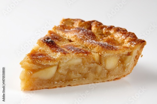 A slice of warm apple pie, dusted with powdered sugar. Golden-brown crust and sweet filling.