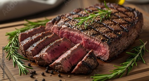 A sliced grilled steak garnished with rosemary on a wooden cutting board close up