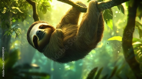 A sloth hanging peacefully from a branch in a lush, vibrant jungle setting.