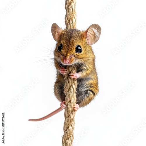 A small, adorable mouse clinging to a rope, showcasing its playful nature.