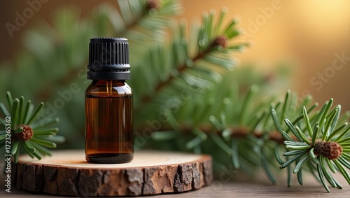A small amber glass bottle of essential oil sits atop a wooden slice, surrounded by vibrant green pine boughs, creating a tranquil and natural scene.