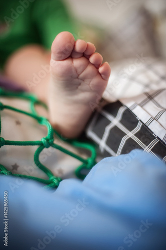 A small bare foot is seen resting on a vibrant baby play mat filled with different textures and colors. Soft fabric and patterns create a warm, inviting atmosphere.