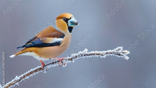 A small bird sitting on a branch covered with frost and ice, showcasing its piercing beak and fluffed feathers to cope with the winter conditions.