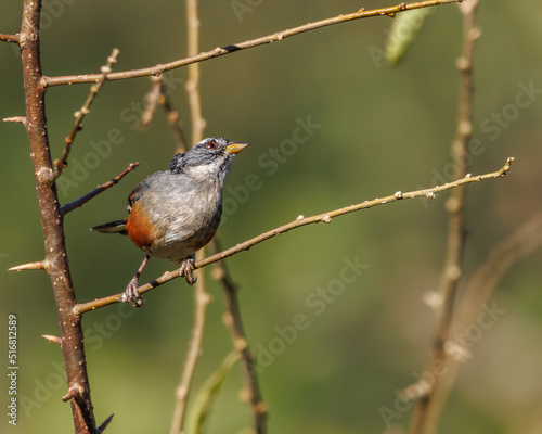 A small bird with a rufous belly and lack of feathers on top of its head perched on a tree branch