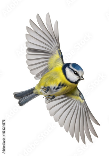 A small blue tit bird (Cyanistes caeruleus) with vibrant blue and yellow plumage, wings spread wide, captured mid-flight, hyper-detailed, sharp focus, isolated on a transparent seamless studio
