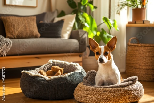 A small brown and white dog sits in a wicker dog bed in a living room.