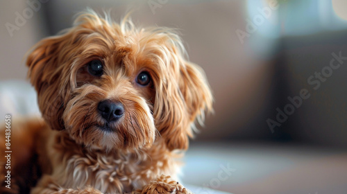 A Small Brown Dog With Large Eyes Looks Upwards With A Curious Gaze