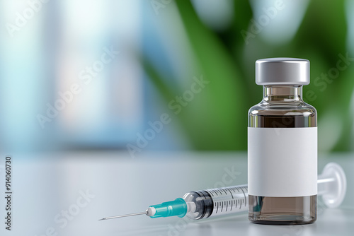 A small brown glass vial with a white label and a grey metal cap, next to a long shiny plastic syringe on a light gray background.
