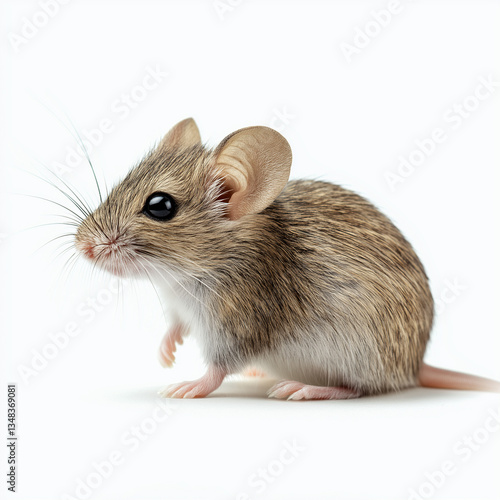 A small brown mouse is shown, likely stock photography. The rodent is isolated on a white background and photographed in a studio setting