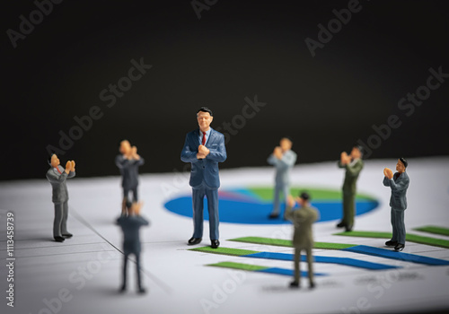 A small businessman stands atop financial charts and graphs, symbolizing success in the corporate world. Represents the concept of leadership and achievement, with miniature human figures set against