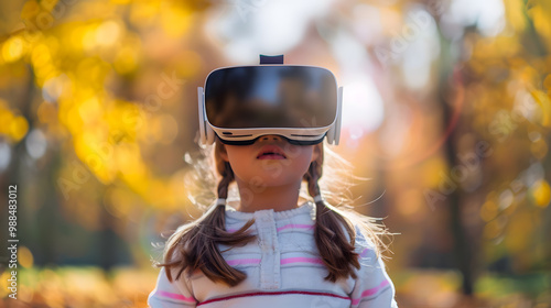 A small child girl or boy wearing virtual glasses plays virtual games. AI Generated