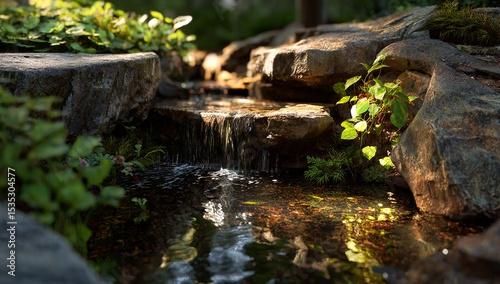 A small, clear stream flows over smooth rocks in the garden, with lush green plants and sunlight filtering through the leaves
