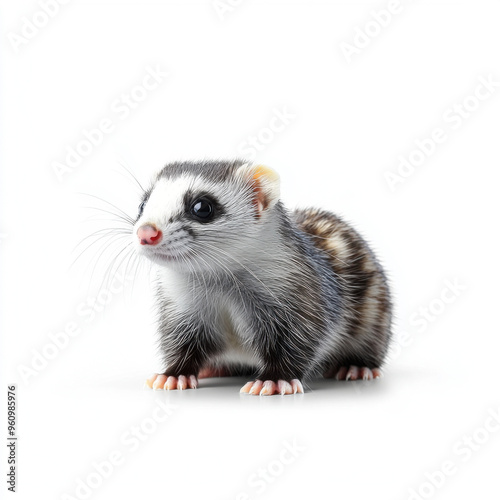 A small, cute ferret sitting on a white background, showing off its inquisitive nature and soft fur in a minimalistic scene.