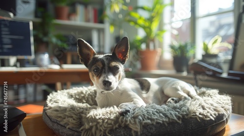 A small dog enjoys a peaceful nap in a sunlit home office filled with plants and warm decor.