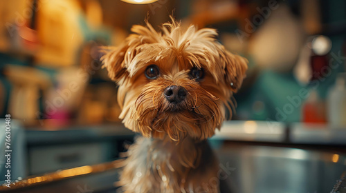 A small dog is in a bathtub with a yellow rubber ball. The dog appears to be enjoying the bath and playing with the ball. dog grooming