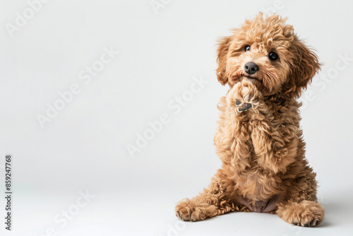 a small dog sitting on a white surface