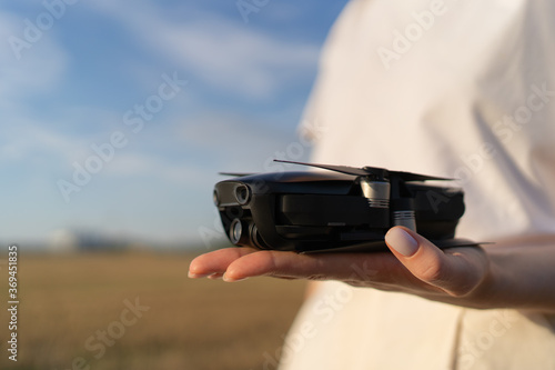 A small drone in hands. Electronic gadget for work and hobby. Quadcopter operator with device