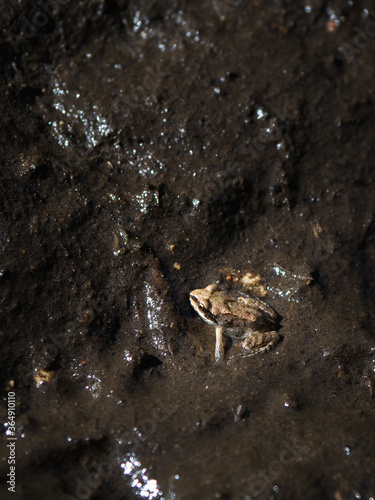 A small frog in the mud at night