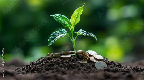 A small green plant emerges from a mound of coins, representing wealth and new beginnings in a bright setting