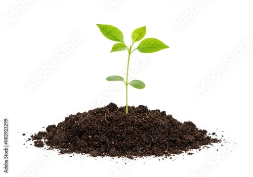 A small green plant growing out of a pile of dark soil against a plain white background studio shot