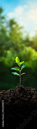 A small green plant is growing in the dirt. Concept of growth and new beginnings