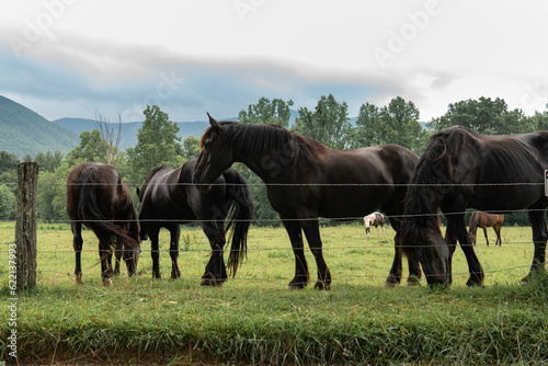 a small group of four large equestrian horses, dark black in color and gathering at the fence at the edge of the corral, a wire and post style fence marks the perimeter boundary