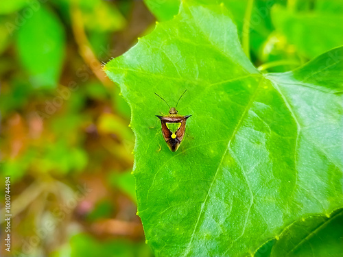 A small insect sitting on a bright green leaf. This insect has a distinctive triangular shape. It has a dark brown body and a yellow spot near the center. The surface of the leaves is clearly visible.