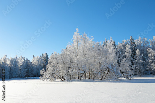 A small islet with frozen white birches and frost flakes in the air