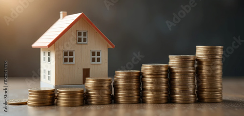 A small model of a house is positioned next to tall stacks of coins, illustrating the concept of real estate investment and financial prosperity. The lighting adds a warm ambiance