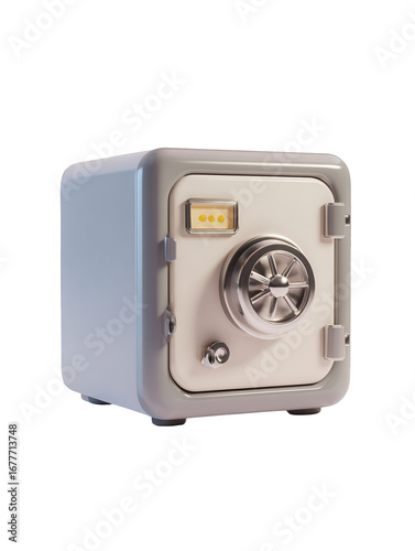 A small, modern gray and white safe with a combination lock, isolated on a transparent background