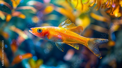 A small orange fish swimming in an aquarium.