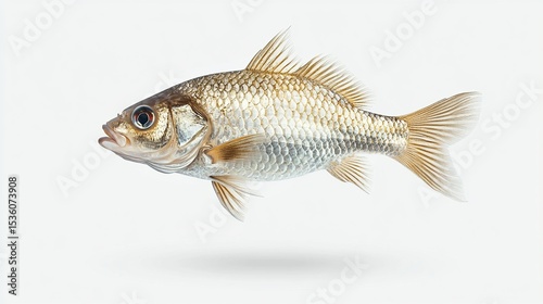 A small, pale gold fish with slightly upturned mouth, fins, and tail, set against a stark white background; showing a subtle shadow beneath