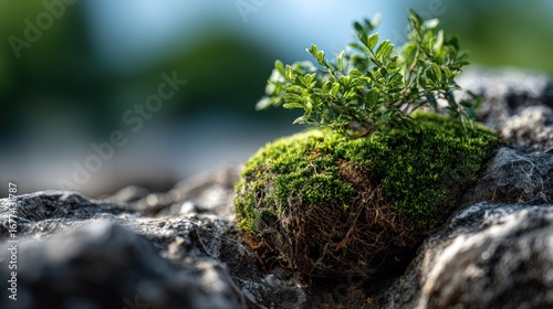 A small plant thrives amidst a bed of moss on a weathered stone surface, showcasing nature's resilience and intricate beauty.