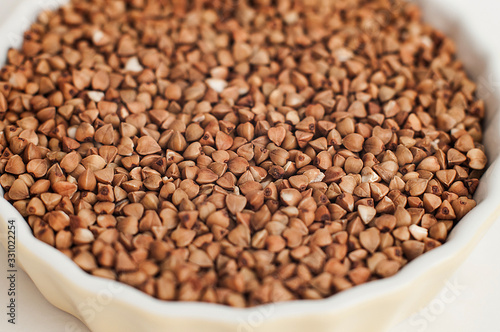 A small plate of buckwheat - traditional Russian meal - on white